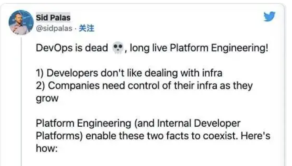 國外大神Sid Palas,一位專門做 DevOps 和 Cloud infra 相關(guān)工作的開發(fā)者,不久前發(fā)出的一條驚悚推特:DevOps is dead,long live Platform Engineering(DevOps已死,平臺工程萬歲!),引爆了開發(fā)者們的焦慮與憤懣。