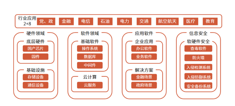 信創,即信息技術應用創新產業,是數據安全、網絡安全的基礎,也是新基建的重要組成部分。信創產業龐大,涉及基礎硬件(芯片、服務器等)、基礎軟件(操作系統、數據庫、中間件等)、應用軟件(OA、ERP、辦公軟件等)、信息安全(邊界安全產品、終端安全產品等)4個部分,其中芯片、整機、操作系統、數據庫、中間件是更為重要的產業鏈環節。