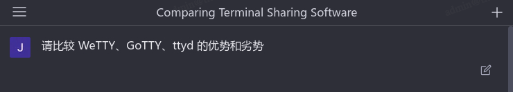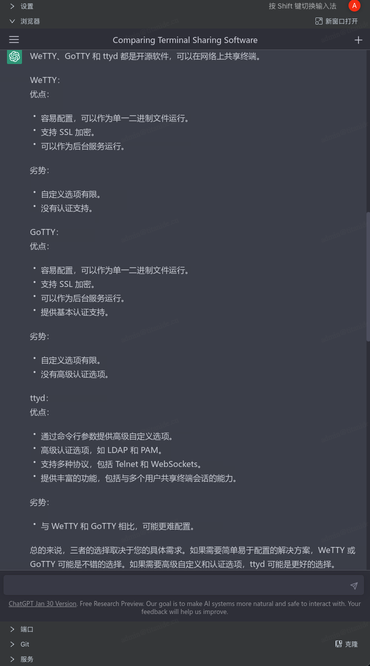 最近,ChatGPT 異常火爆,各行各業的人都在談論 ChatGPT, 以上是個人對 WeTTY、GoTTY、ttyd 做的橫向比較,那 ChatGPT 是怎么看的?請看我在 TitanIDE 和 ChatGPT 的對話: