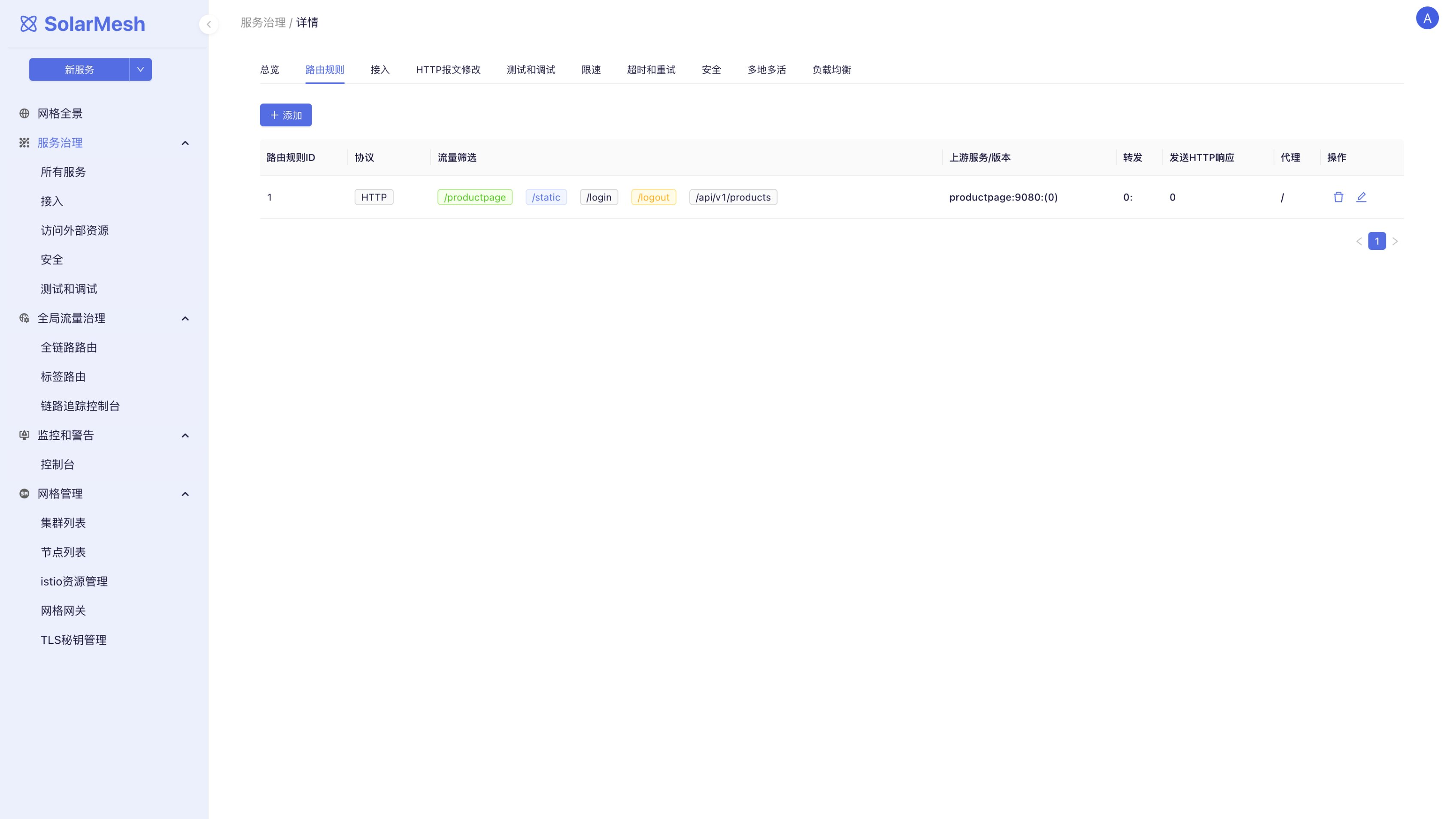 導入SolarMesh的所有服務都會出現在“服務治理>所有服務”中,用戶可以在這里做精細的設置。這些設置被劃分為: