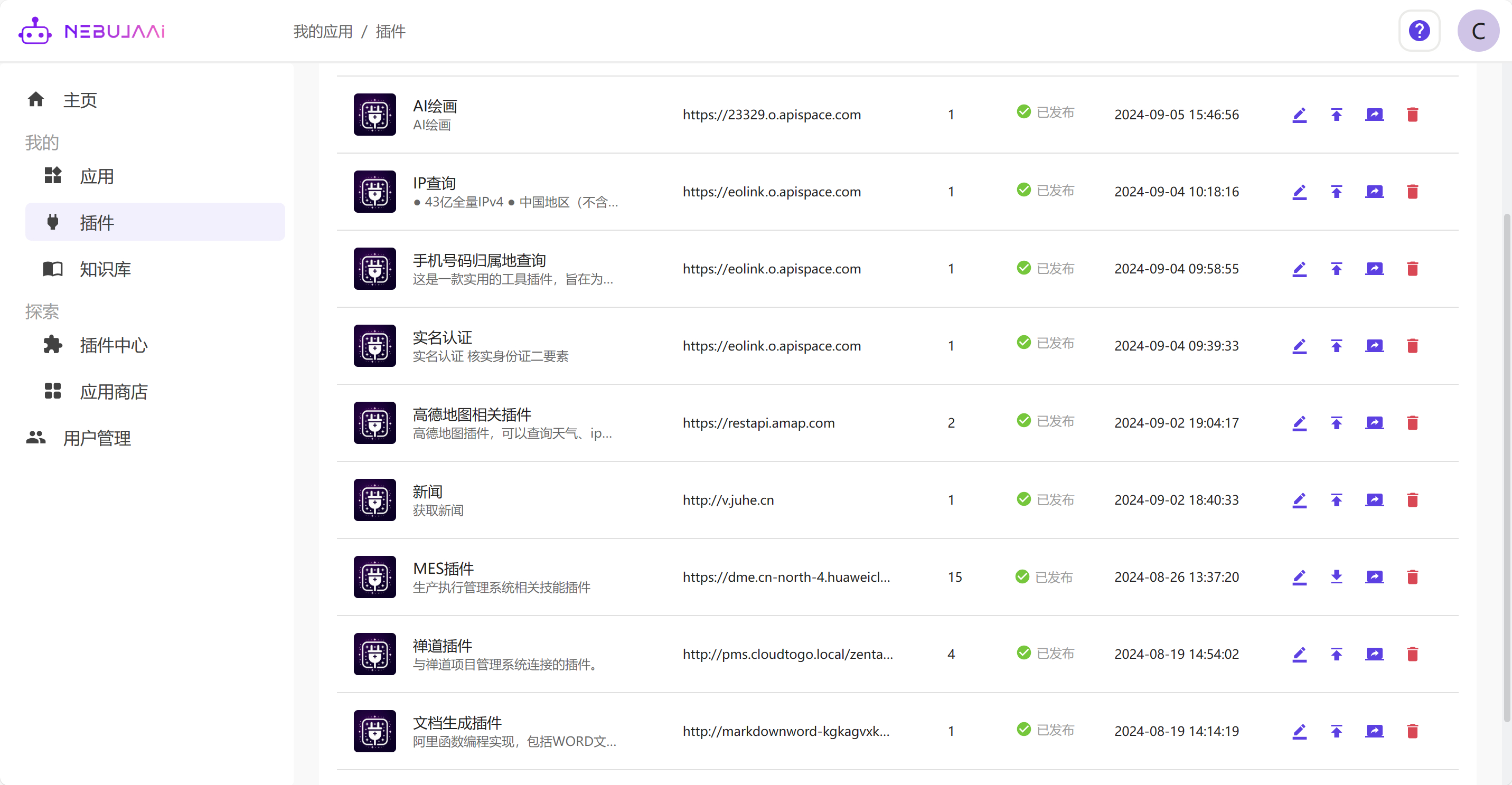 目前 NebulaAI 支持自定義添加多款插件,延伸拓展大模型技能,賦予智能應用專屬的超能力。