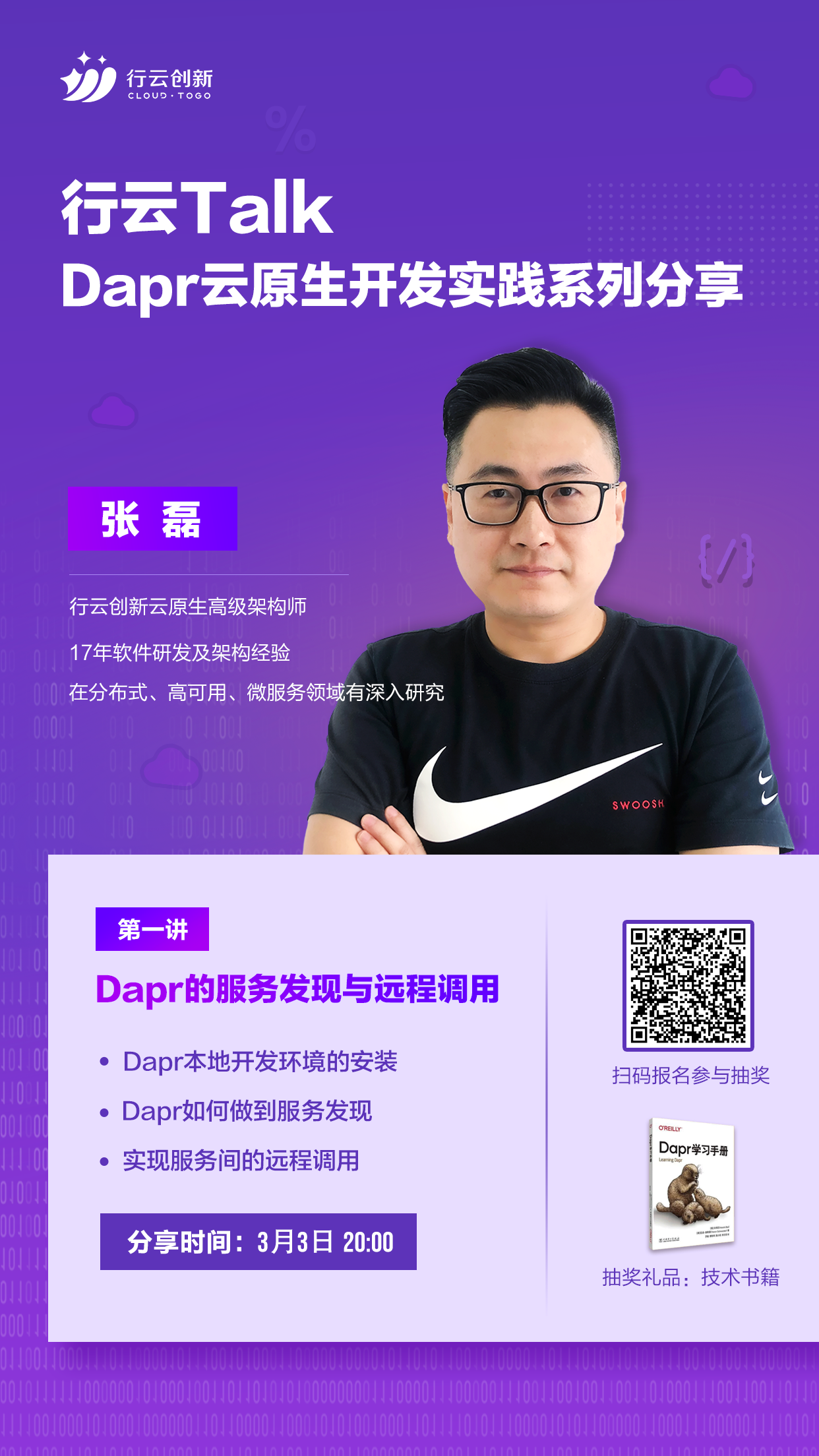 3月3日20:00,Dapr云原生開發實踐系列第一期內容即將開講,leyu.樂魚創新云原生高級架構師張磊分享:Dapr的服務發現和遠程調用,介紹Dapr本地開發環境的安裝,Dapr如何做到服務發現以及實現服務間的遠程調用。