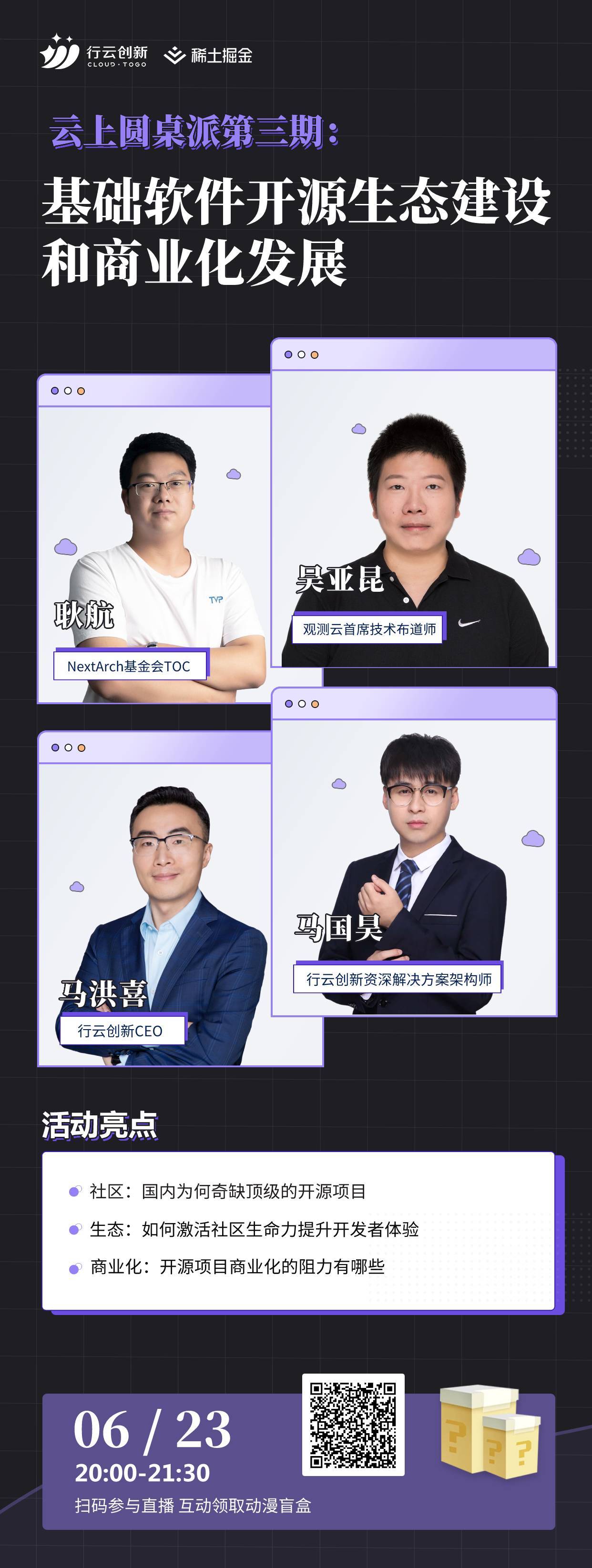 6月23日晚上20:00,云上圓桌派第三期《基礎軟件開源生態建設和商業化發展》即將開啟,活動邀請NextArch基金會TOC耿航,觀測云首席技術布道師吳亞昆,leyu.樂魚創新資深解決方案架構師馬國昊三位大咖和leyu.樂魚創新CEO馬洪喜一起對國內的開源生態現狀、社區的建設及商業化發展等多個問題一起展開討論。