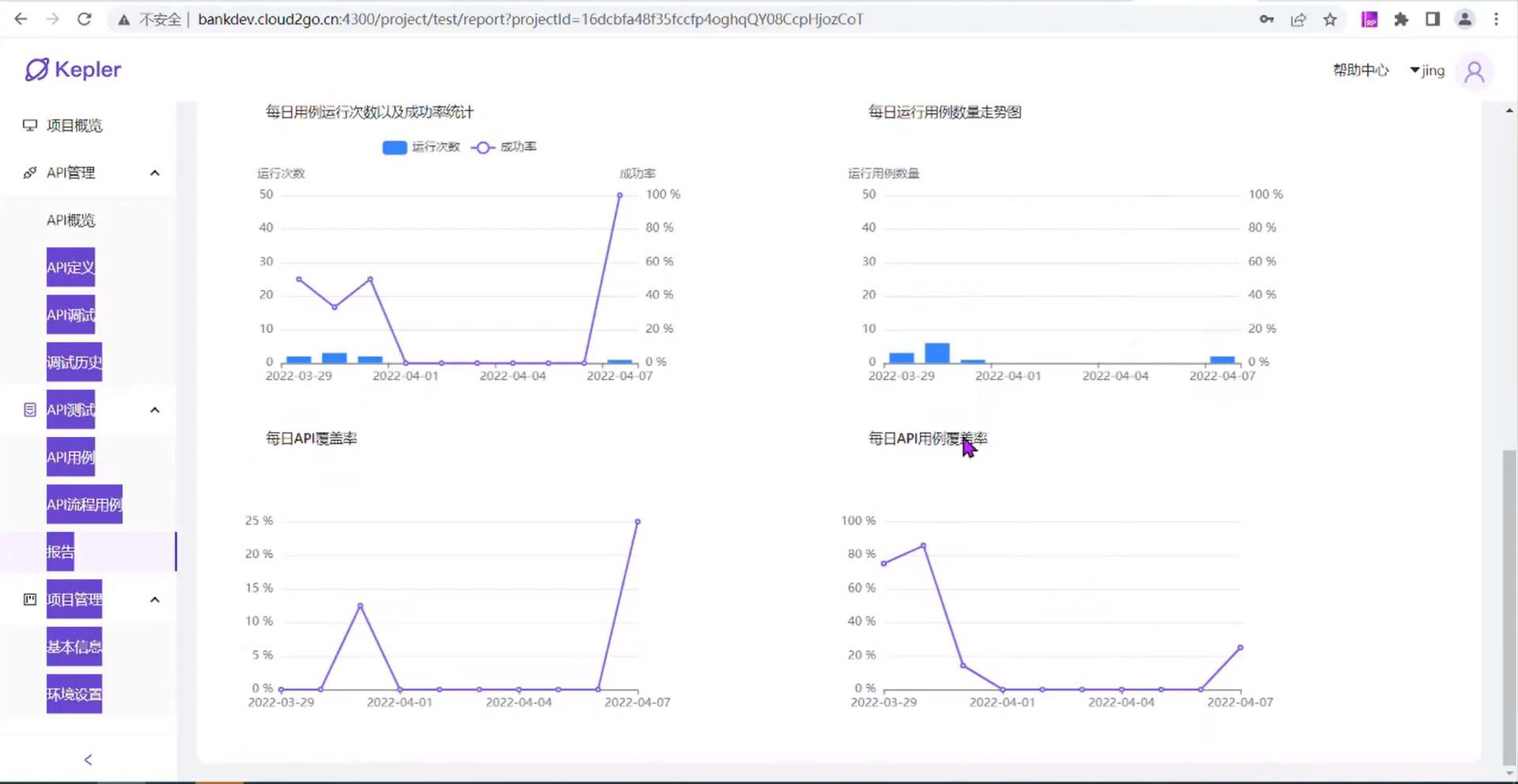 系統會自動統計自動化測試通過率、覆蓋率等信息,并且會顯示近期測試通過率趨勢,方便您了解項目質量變化情況,根據趨勢非常直觀得出軟件可能潛在的缺陷數量